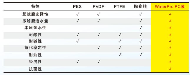 WaterPro PC膜材料具有本征親水性,因而具有: